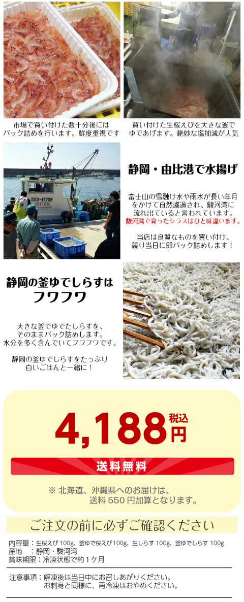 内容:生桜えび100g、生しらす100g、釜あげ桜えび100g、釜あげしらす100g