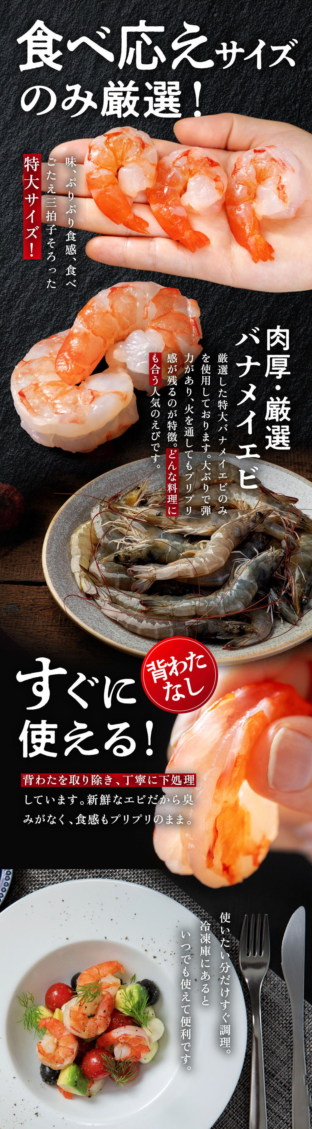 お忙しい皆様がお料理の際に少しでも時短できますように頭・殻・尻尾・背ワタを全て丁寧に取り除いています。