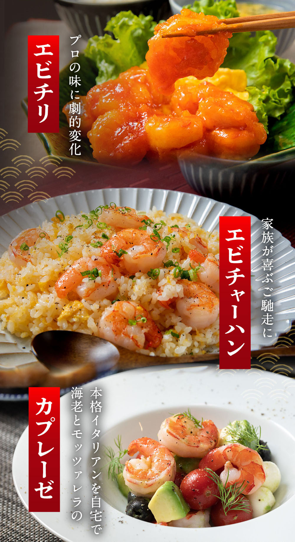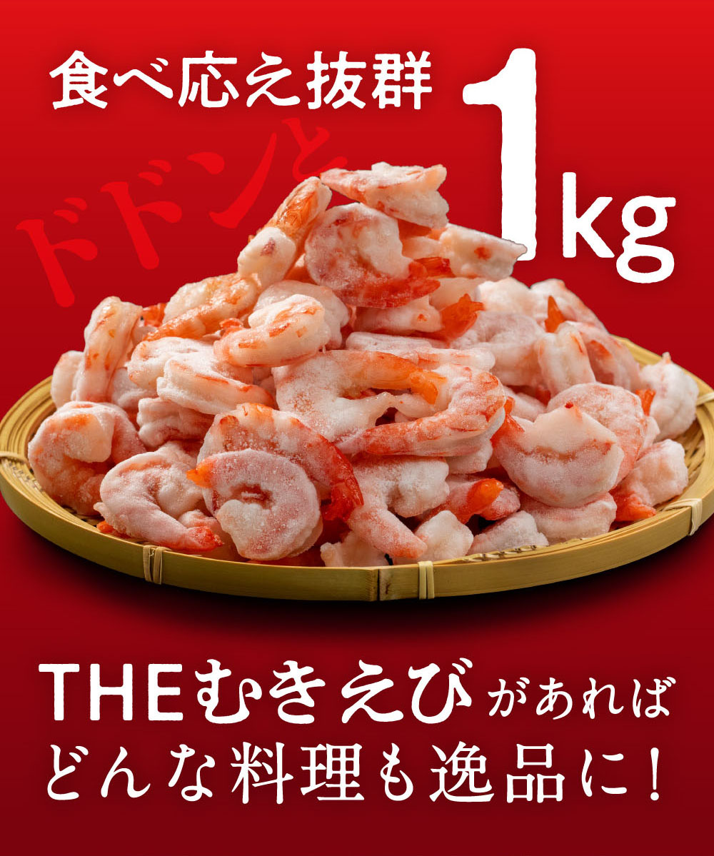 エビチリ・エビ炒飯・エビ野菜炒め・エビマヨ等をボリュームいっぱいの1キロお得用パックでお届けいたします。ぜひご家庭で「ぷりぷりエビ美味しい!」をご堪能ください。
