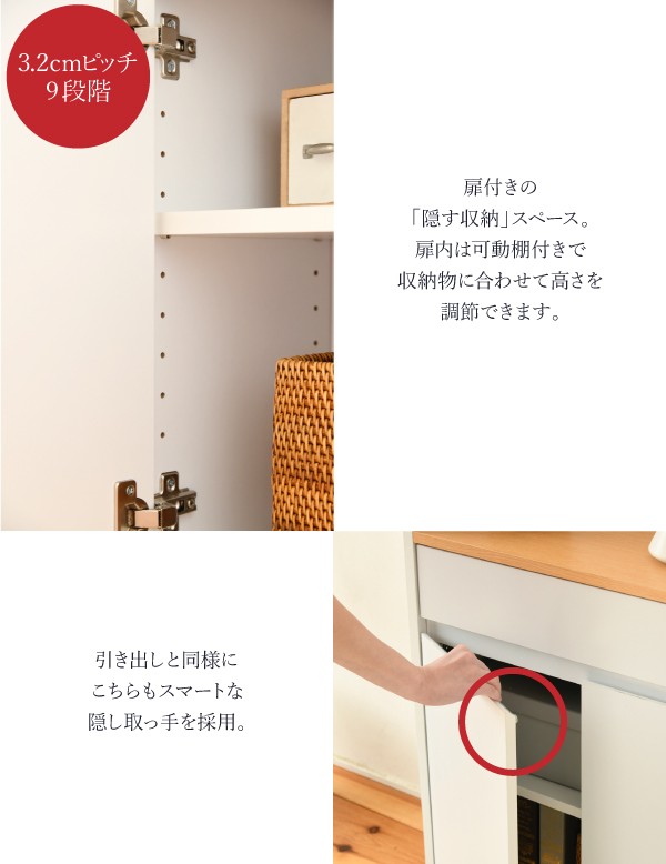 薄型で省スペースなのでリビングにも最適なキャビネット。シンプルなデザインと扉付きのラックは「隠す収納」で見た目もスッキリ。家族や来客の集まるリビングに1台あるだけで、生活感を扉の向こうに隠せます。仕事関係の書類やアイロンなどの小型家電、裁縫道具のような趣味のものまでその使い道はさまざま。