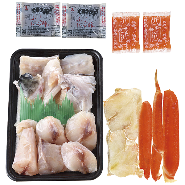 内容量:ふぐちり(シロサバフグ切身・トラフグアラ)200g、ゆでずわいがにカット100g、ふくポン酢・もみじおろし 各10g×2