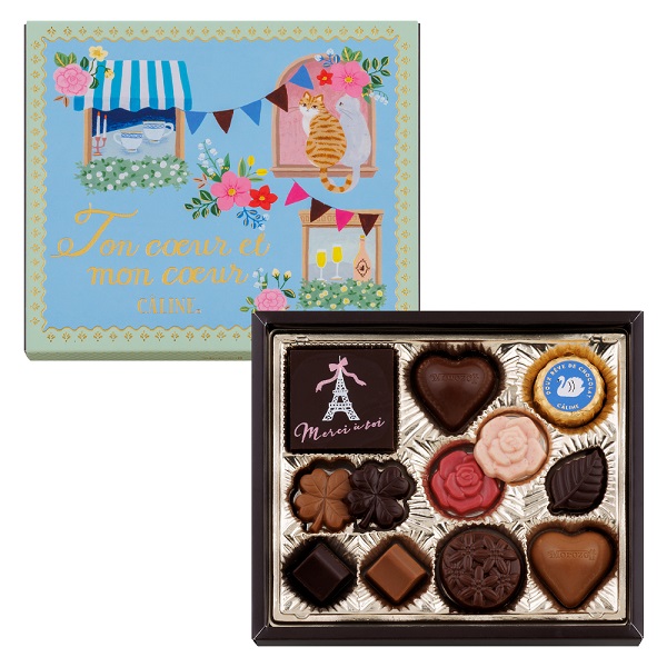 バラやクローバーなど様々な形のチョコレートをボリュームたっぷりに詰め合わせました。定番のミルク、エキストラミルク、セミスイートの味わに加え、ポイントにストロベリーとカシスの味わいも。2匹の猫が描かれたブルーとグリーンの爽やかなパッケージです。
