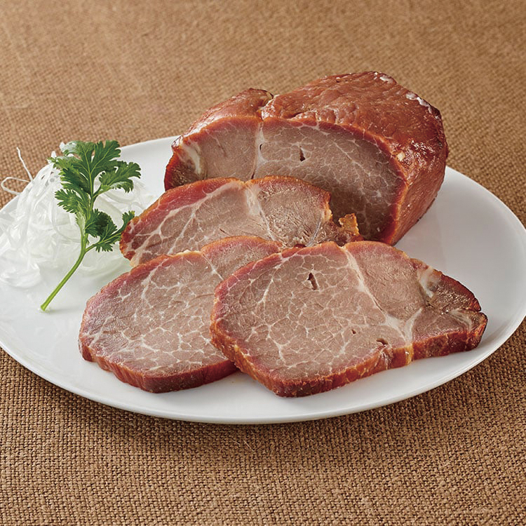 赤身と脂身のバランスのよい豚肩ロースを、余分な脂を落として焼き上げました。