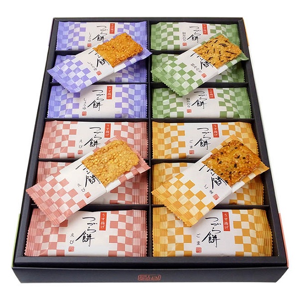 粒々食感とサクサクパリッとした歯ごたえ、お米の風味も大切に「しょうゆ」「ごま」「えび」「刻みのり」の四種類の美味しさをご用意いたしました。