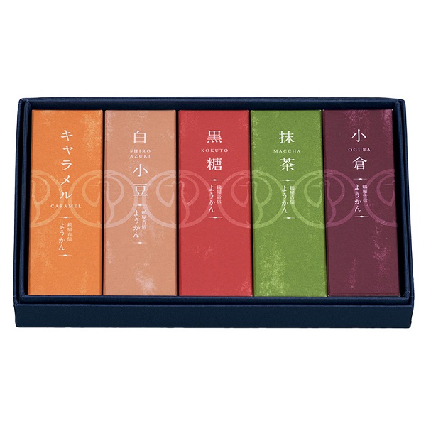 素材と風味にこだわった鶴屋吉信の新しい羊羹のかたちです。小倉(丹波大納言小豆)、抹茶(京都宇治抹茶)、黒糖(沖縄産黒糖)、白小豆(備中産白小豆)、キャラメルの5種。