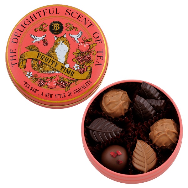 りんご、ラズベリーの果実味あふれるフレーバーティーチョコレートを閉じ込めたミニトリュフや、2種類の紅茶葉を混ぜ込んだ薄型チョコレートを、猫が描かれた手のひらサイズのかわいい缶に詰め合わせました。