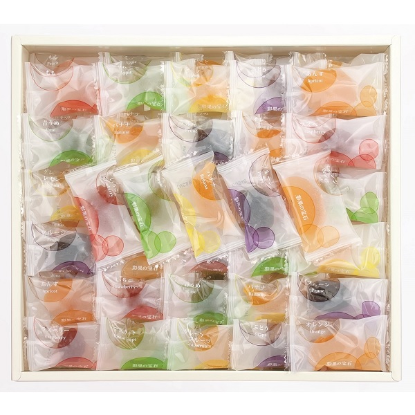 あんず・パイン・バナナ・りんご・もも・青うめ・赤うめ(しそ入り)・グレープフルーツ・ぶどう・マスカット・オレンジ・いちご・プルーン・レモン・ラズベリー