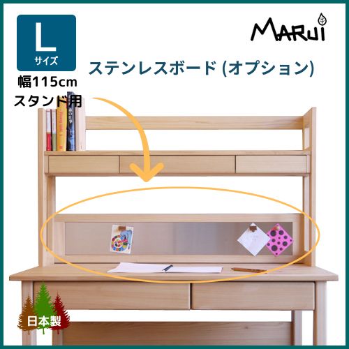 ヒノキ学習机LM型・L型(幅115cm)の上置き(デスクスタンドL型)に取り付けて使う、ヒノキフレームのステンレスボード(単品)です。