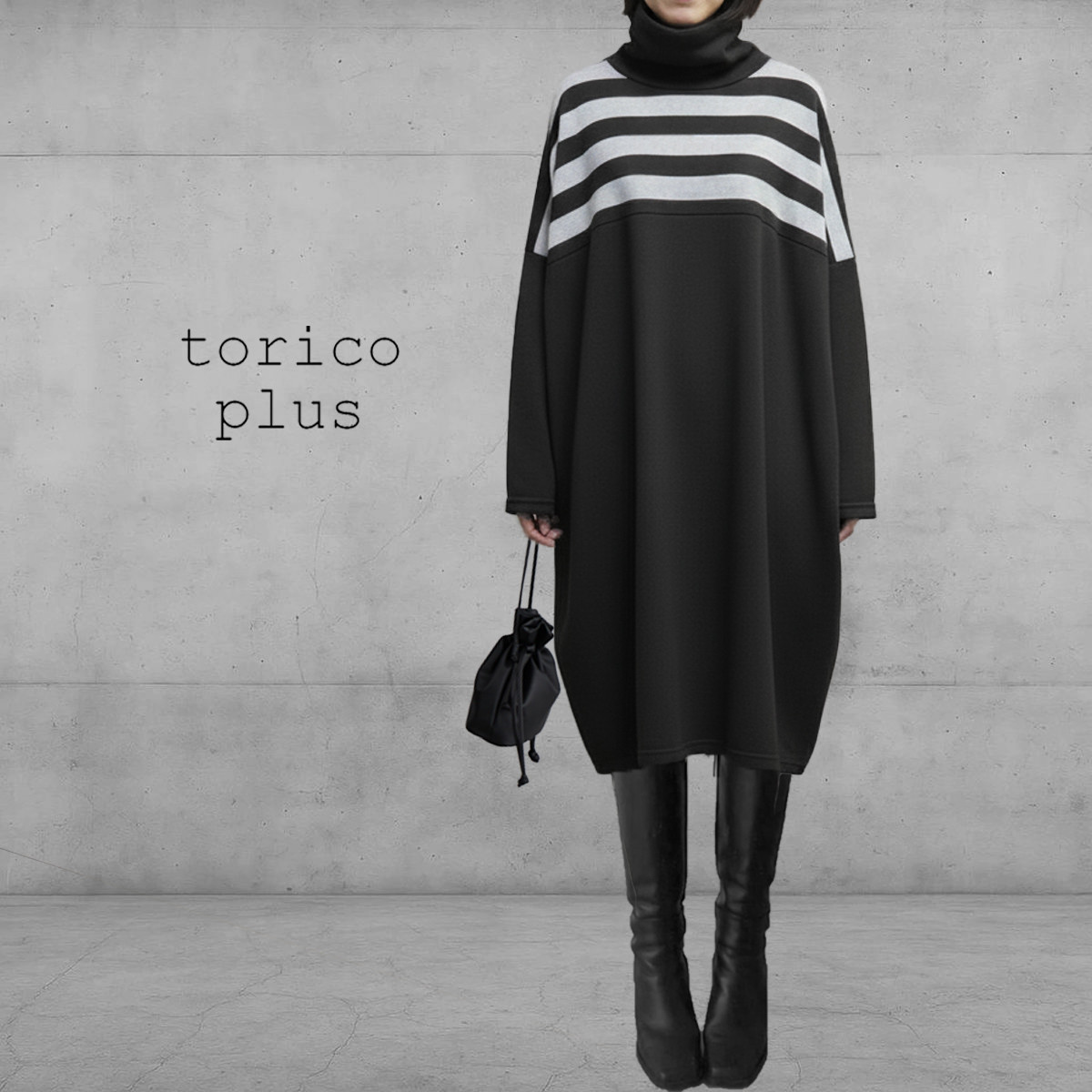 チュニック ワンピース タートル 長袖 トップス ドルマン 配色 チュニックワンピ ゆったり 大きいサイズ プルオーバー レディース 黒×ボーダー