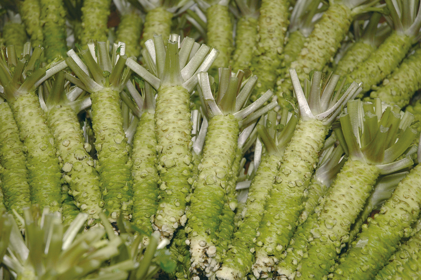 わさびは茎に近い部分ほど組織が新しいため風味(甘み)があります。茎を外側から手で1本1本取り外し、茎のつけ根から皮ごとすりおろしていきます。