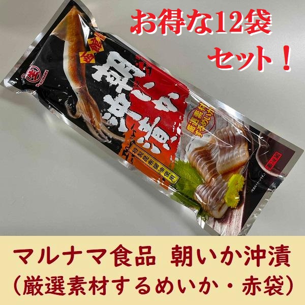 お得な12袋セット!飲食店などプロのお客様からのご注文も非常に多い商品です。マルナマ食品の人気の朝いか沖漬赤袋です。(青袋よりイカのサイズが若干大きいですが、味は同じです)