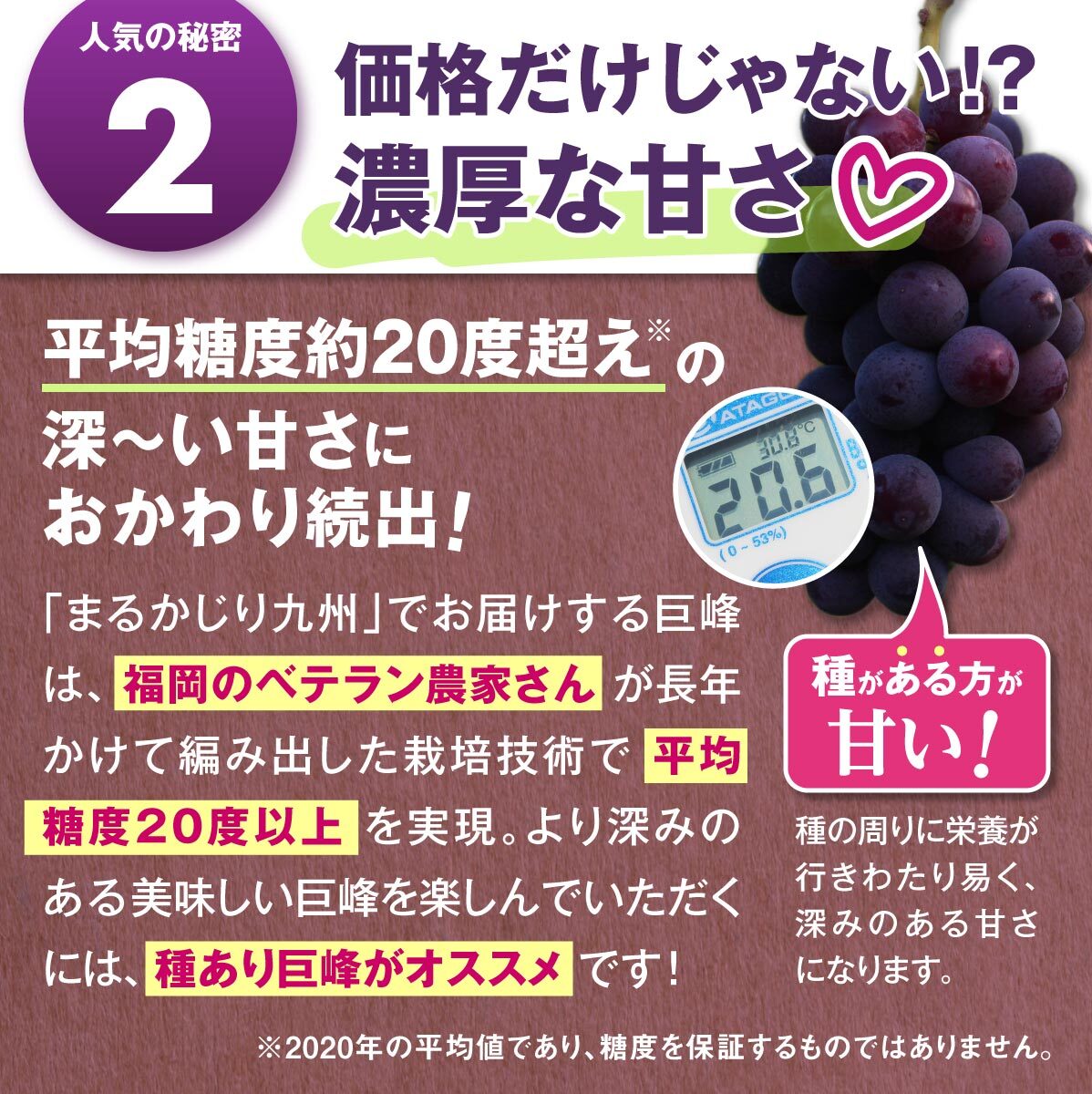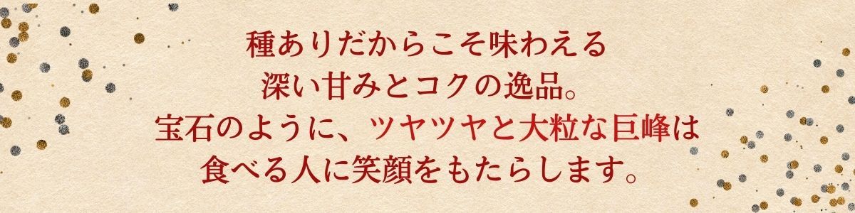 近年は食べやすさから種なし巨峰も人気がありますが、種あり巨峰のほうが種の周りに栄養が行きわたりやすいため甘味と酸味、渋みのバランスが良く、深みのある巨峰本来の美味しさが味わえることから、どの農家さんも種あり巨峰をお勧めしています。