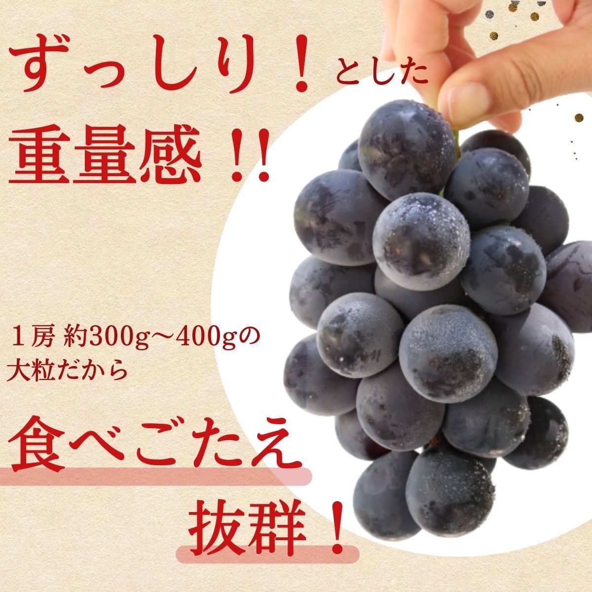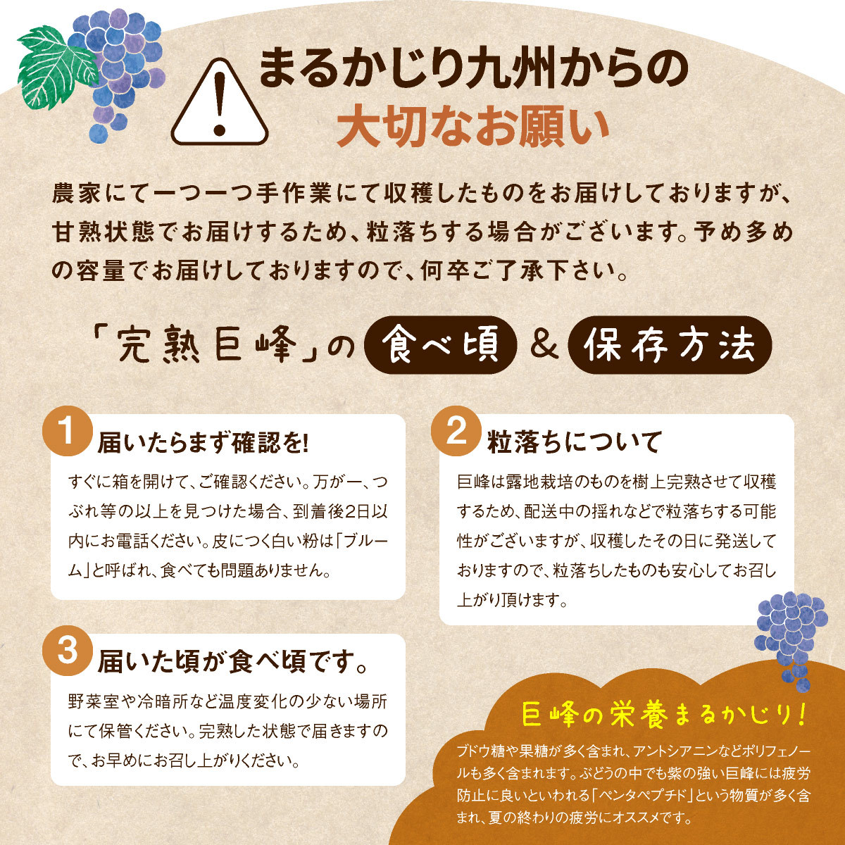 | 品質について | 露地栽培の巨峰になります。完熟した巨峰を収穫した日のうちに選果・出荷しているので、新鮮なものをお届けします。 平均糖度は20度前後です。(種あり) ※早朝に収穫したものを産地から直接お届けしているため、お受け取りに日数がかかると茎が変色する場合がございます。しかし、果肉に影響のない新鮮な巨峰を選んで梱包していますので、味や品質に問題はございません。 ※巨峰の表面に付着している白い粉のようなものは、ブルームと呼ばれる脂質です。ブルームは、果実に含まれる脂質の蝋が表面に出てきたもので、雨や病気から実を守り、保湿をする役割のある自然現象です。新鮮な証拠ですので、安心してお召し上がりください。 |