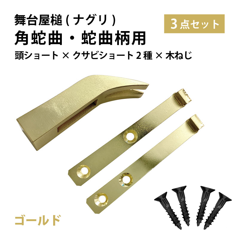 「角蛇曲」および「蛇曲」の柄に対応したマルキン印 舞台屋鎚(ナグリ)頭 ショート(95mm)と3.2mm極厚クサビ(ショート狭/広)×2本、鉄製木ねじ×4本がセットになった商品です。