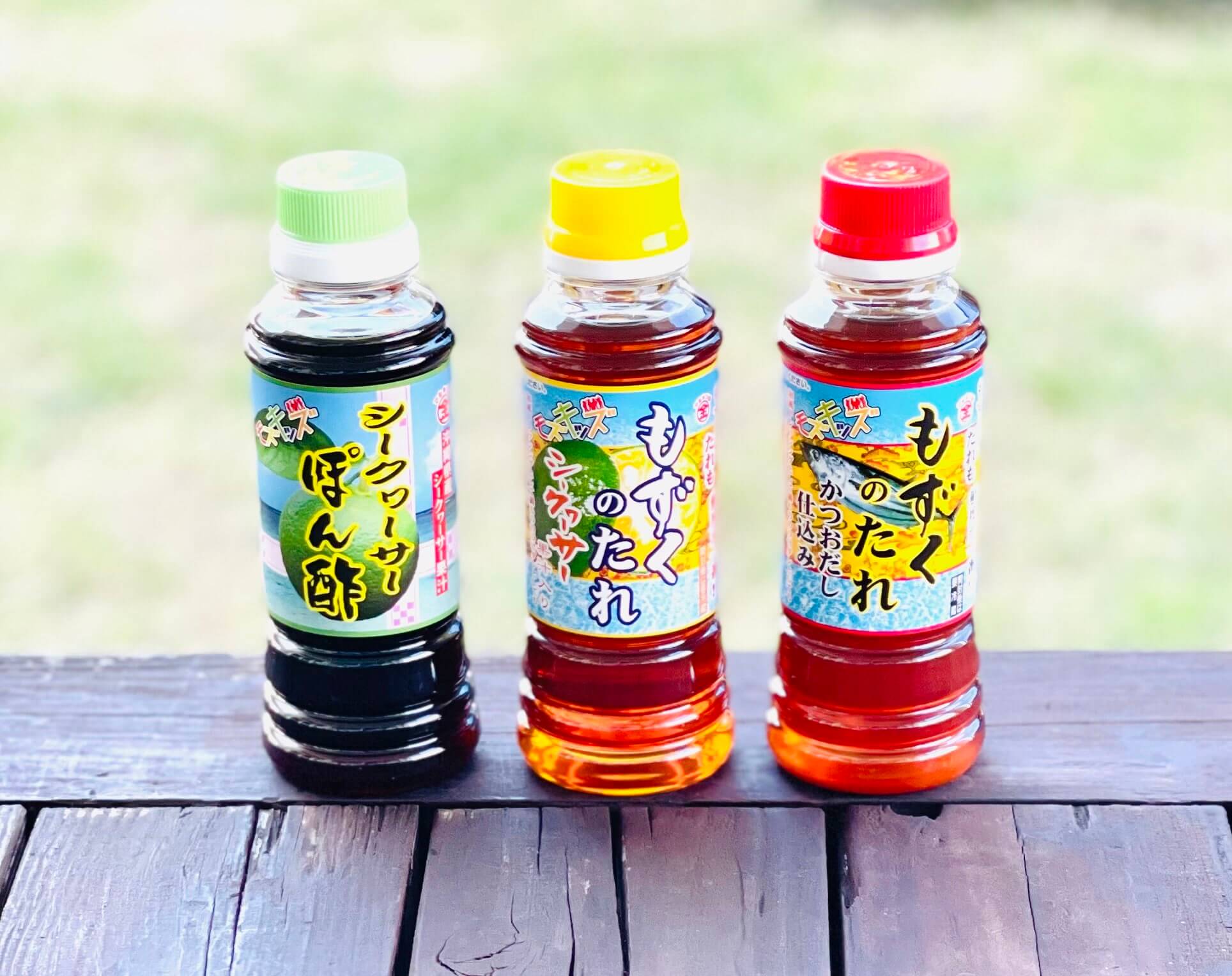 マルキン商店で人気の3種(もずくのたれ、シークヮーサー、かつおと、シークヮーサーぽん酢)を