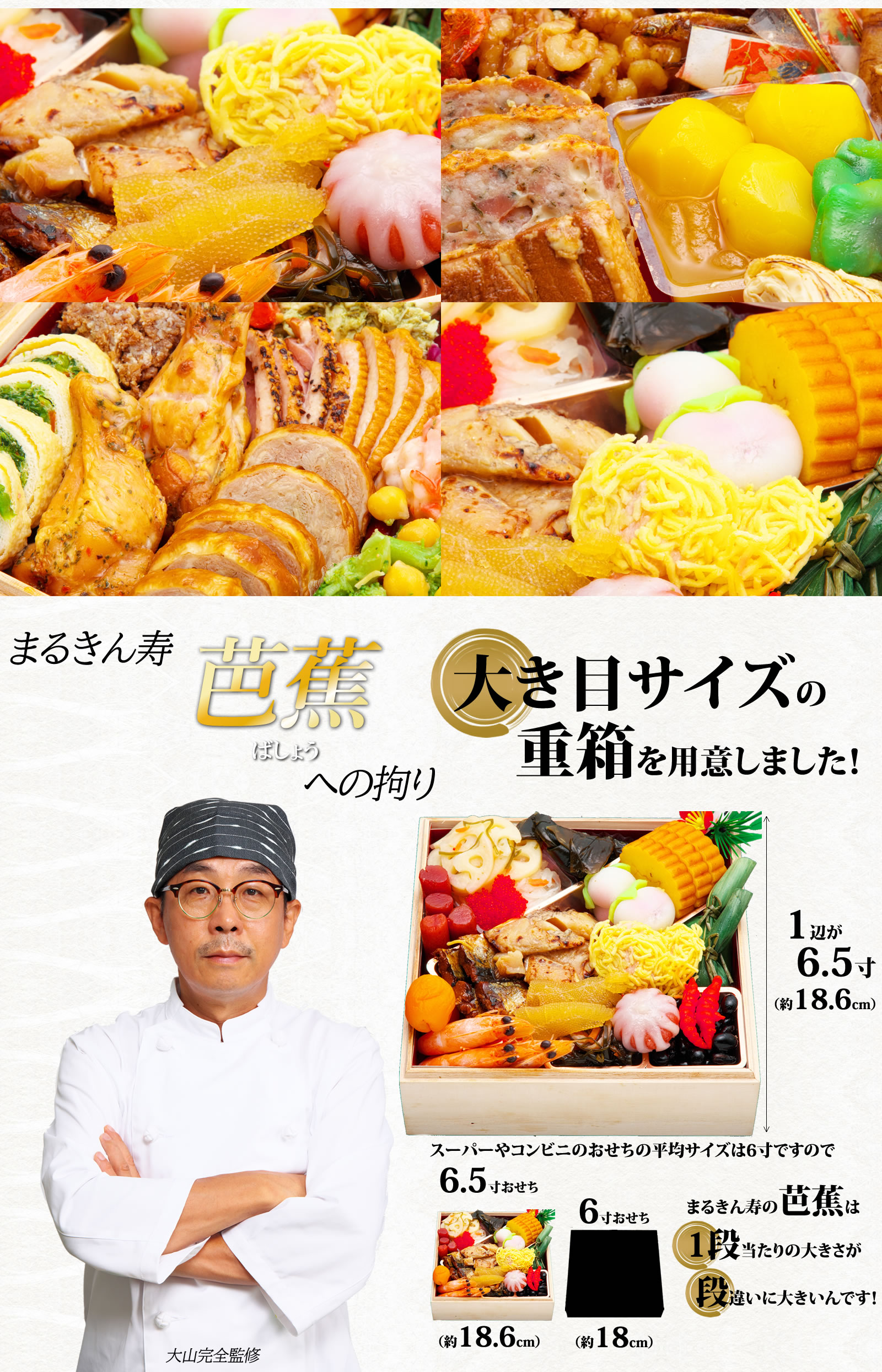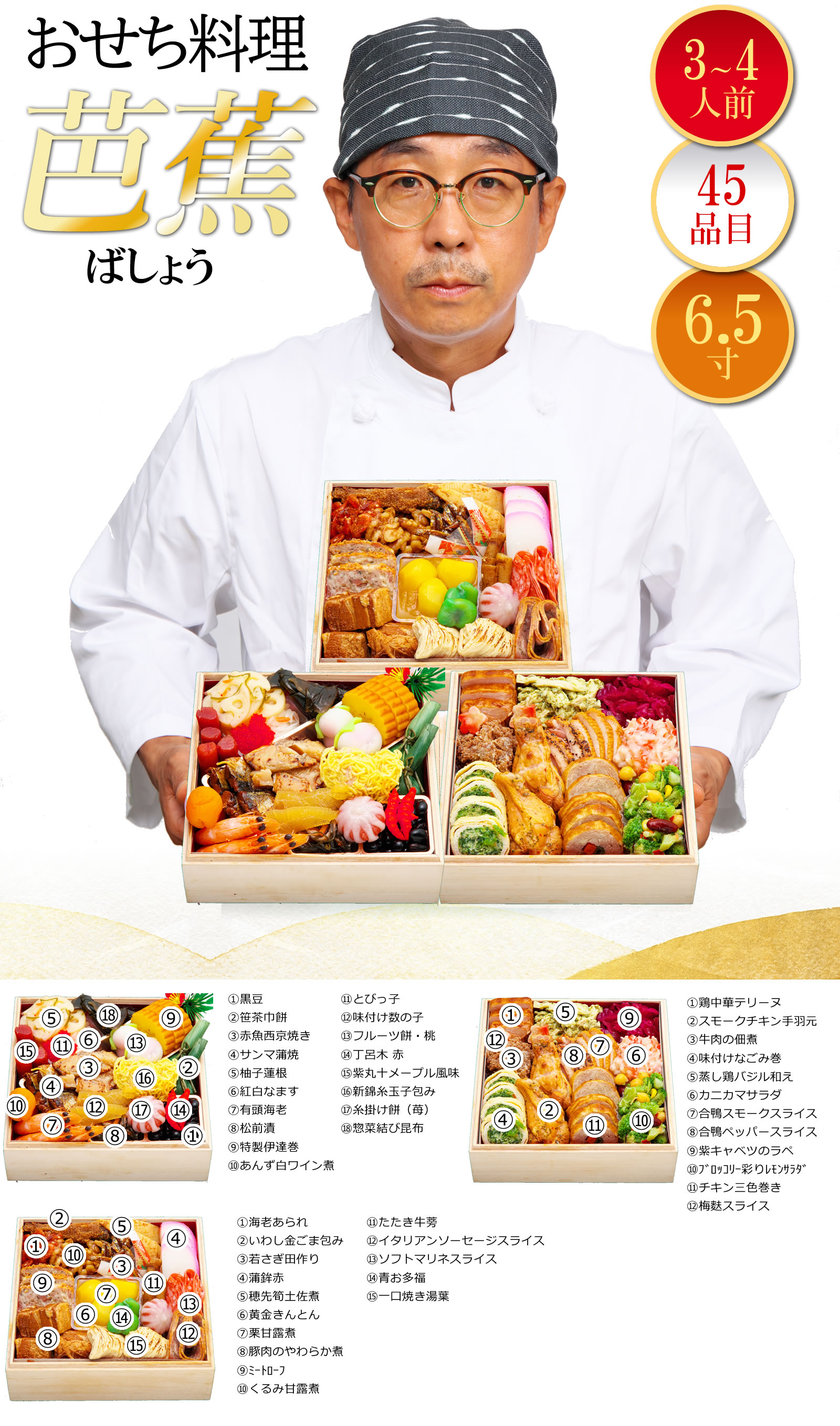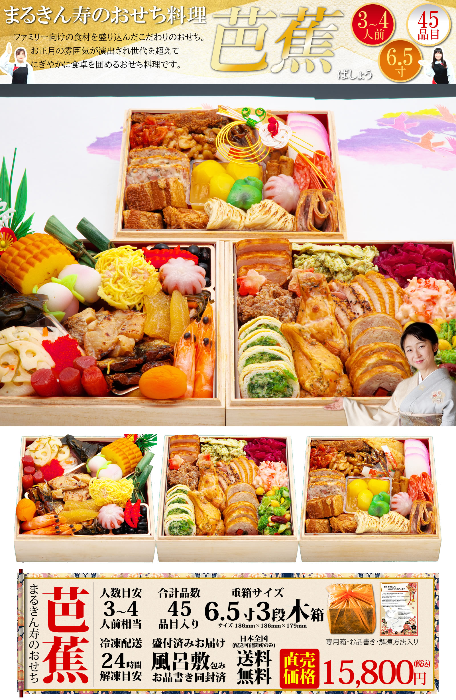 【完売御礼】三段重おせち「芭蕉」 6.5寸3人前4人前45品入 全国送料無料