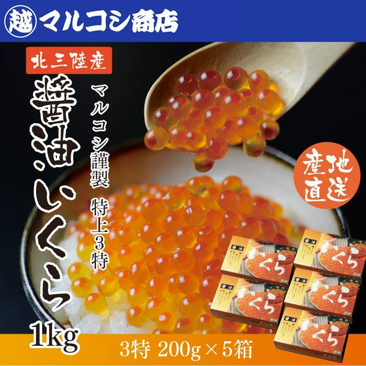 送料無料 岩手産 特上3特 いくら醤油漬け 1kg(200g×5) いくら造り40有余年 マルコシ謹製 醤油いくら お取り寄せ 海鮮丼 いくら丼 お中元 夏 ギフト 鮭卵