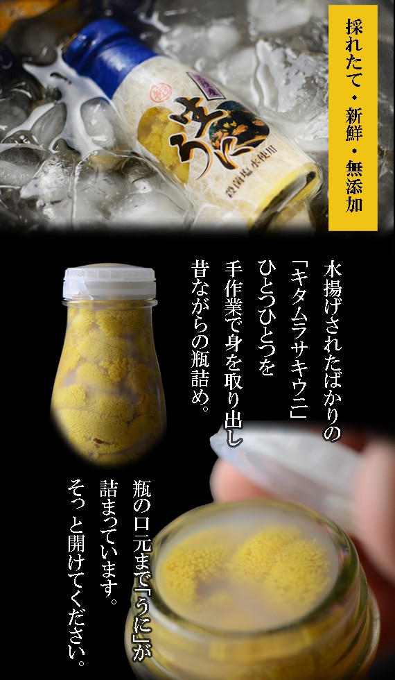 殻からひと粒ひと粒身だけをとりだし、滅菌済みの海水に入れただけの100%本物の生ウニです。