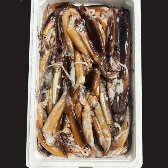 箱に詰めたイカをそのまま急速冷凍にしております。そのため、すべてくっついて凍っております。