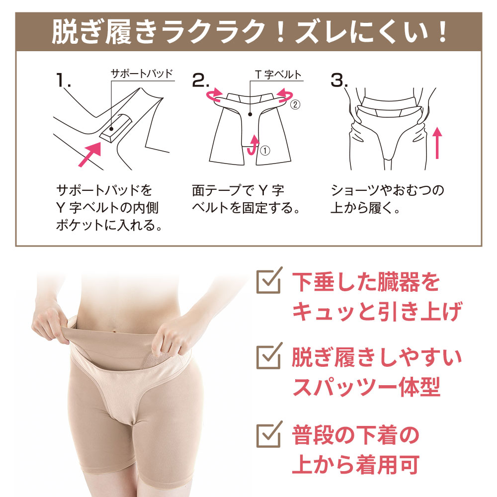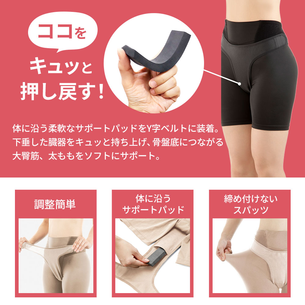 体に沿う柔軟なサポートパッドをY字ベルトに装着。下垂した臓器をキュッと持ち上げ、骨盤底につながる大臀筋、太ももをソフトにサポート。