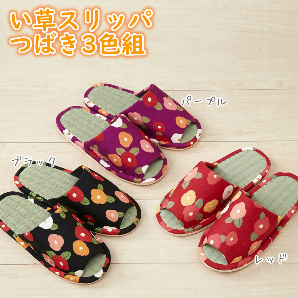 【送料無料】 い草スリッパつばき3色組 イグサ イ草 いぐさ 天然素材 畳 たたみ さらさら 室内履き ルームシューズ 夏用 来客 かわいい ブラック パープル レッド 椿 ツバキ 和柄 和風 花柄