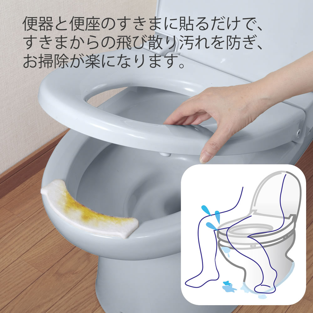 便器と便座のすきまに貼るだけで、すきまからの飛び散り汚れを防ぎ、お掃除が楽になります。
