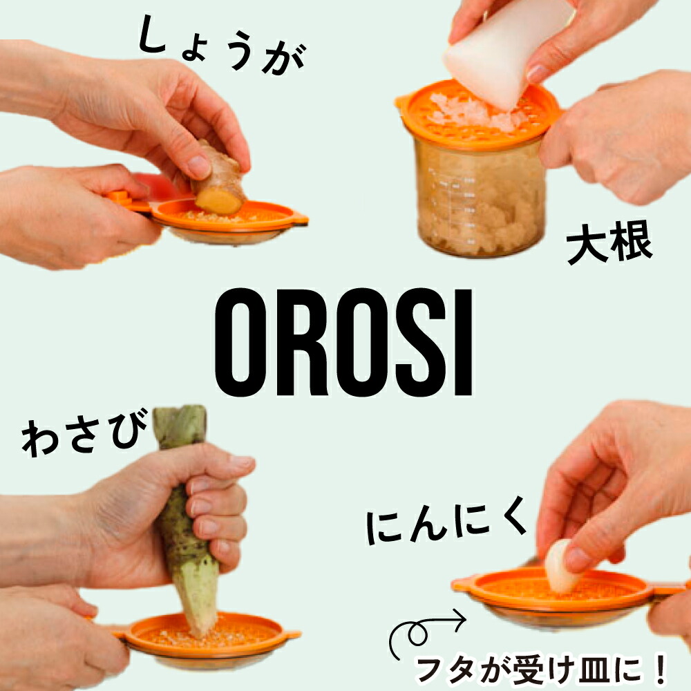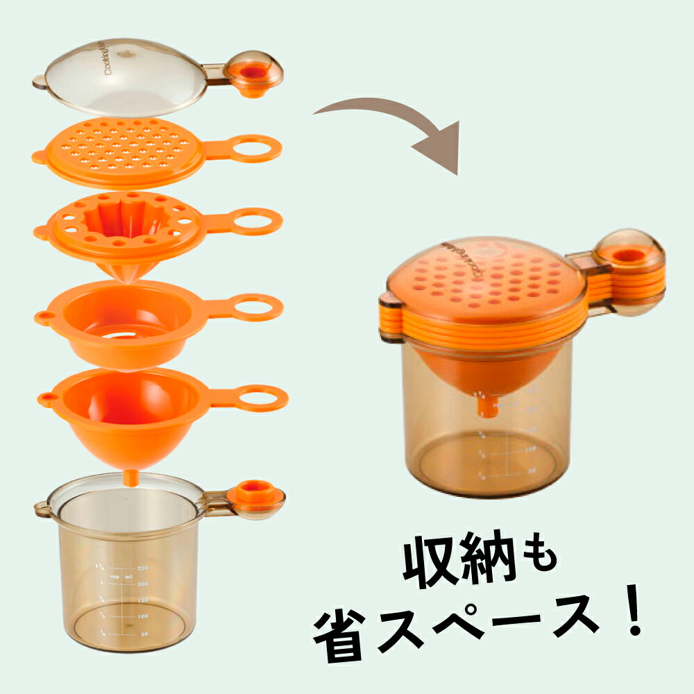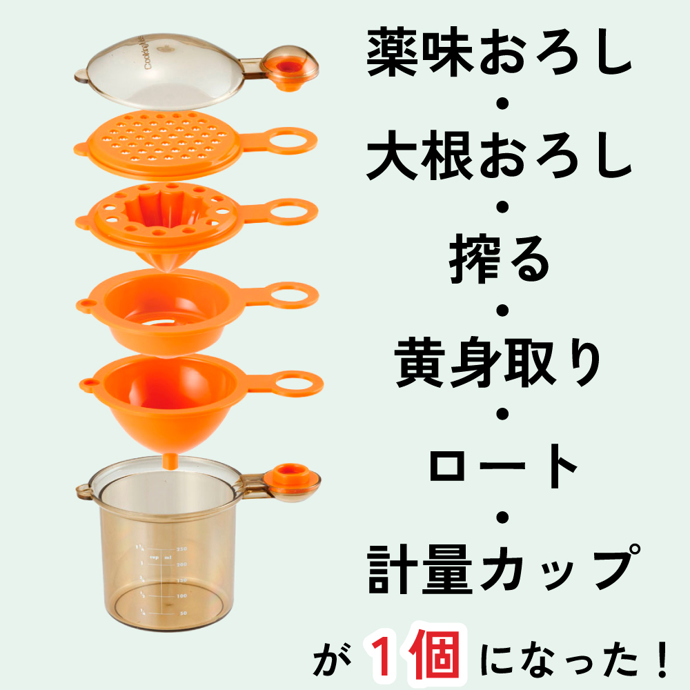◆薬味おろし、大根などのおろし、レモン搾り、黄身取り、ロート、計量カップの6つの機能がついています。