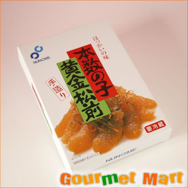 北海道産するめを使用した、手造り松前漬けです。松前漬けは北海道道南の「松前藩」の郷土料理が発祥で、元々数の子が豊富に取れていた時にスルメと昆布を合わせて塩で漬け込んだものです。現在では数の子が希少なものとなってしまった為に、スルメと昆布を主体に塩漬けされた松前漬けとなりつつあります。この黄金松前けは、本数の子をたっぷりと使用した松前漬けです。函館布目食品の北海道観光土産品協会推奨品。ご飯のおかず、お酒の肴にぴったり。北海道らしい生珍味です。