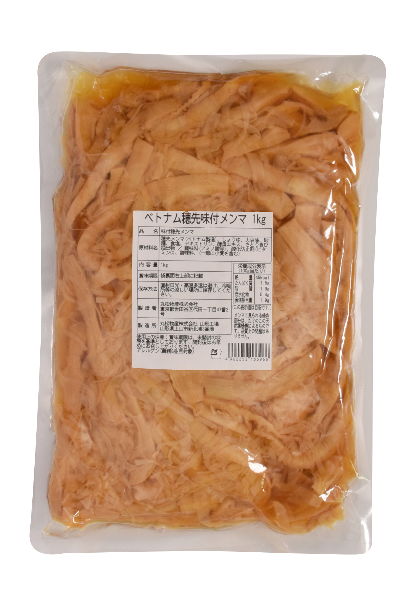 *原材料名:穂先メンマ(ベトナム製造)、しょうゆ、大豆油、砂糖、食塩、デキストリン、酵母エキス、さとうきび抽出物 / 調味料(アミノ酸等)、酸化防止剤(ビタミンC)、酸味料、(一部に小麦を含む)