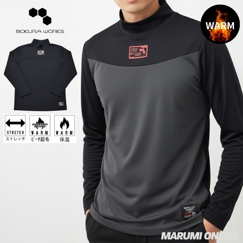 ボクラワークス 秋冬 防寒 インナー シャツ ハイネック 裏起毛 背中二重 暖かい ストレッチ スポーツ キャンプ 仕事 アウトドア