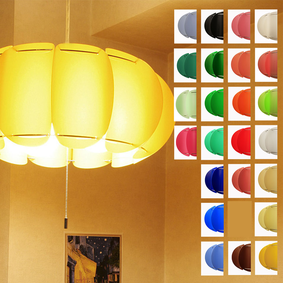 ★ランプシェード+3灯用ソケットの組み合わせ。電球別売です。12枚のポリプロピレン素材の丸いシートを上下のスチール製フレームにはめ込んだ ポップでキュートなペンダントライトです。まさに<pumpkin>'のイメージで、お部屋が楽しくなること間違いありません! 全24色の豊富なカラーバリエーションからお選び下さい。かんたん組立式です。 白熱灯、電球形蛍光灯、LED電球に対応しておりますので、ご用途に応じてお使い下さい。