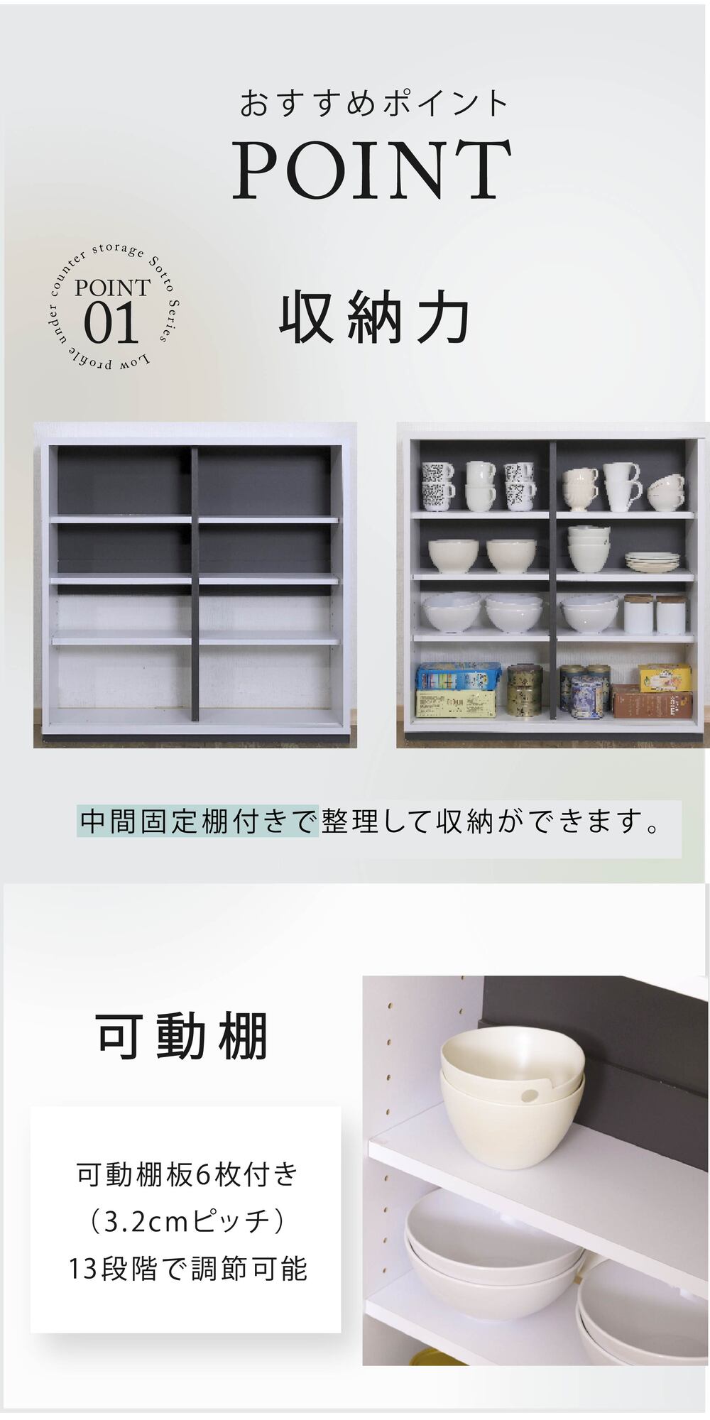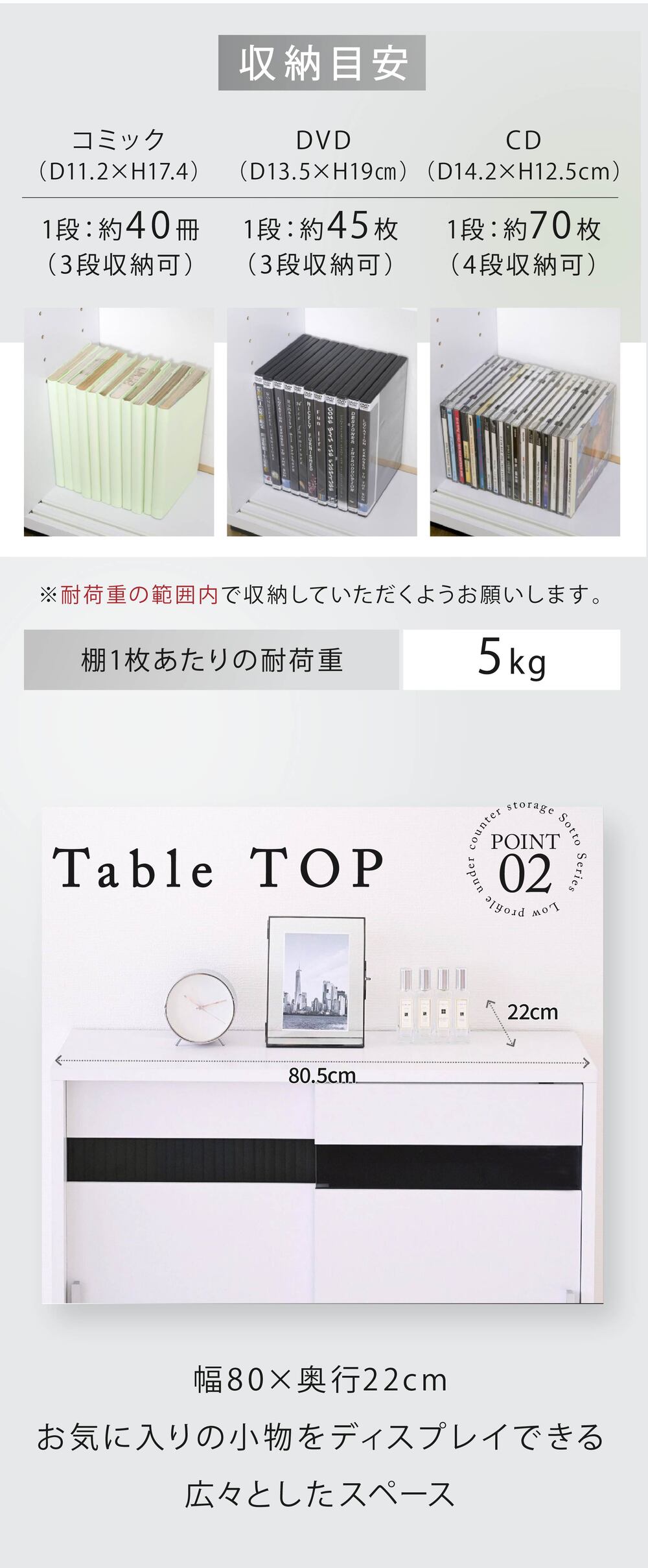 可動式の棚板付きで、食器等はもちろん、CDやDVD、コミックも綺麗に収納。配線孔がついているのでルーター収納としてもご使用できます。