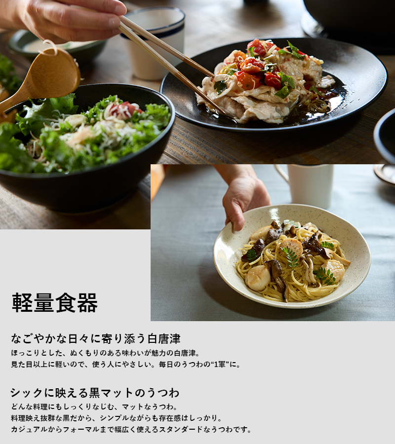 | 商品説明 | なごやかな日々に寄り添う白唐津 シックに映える黒マットのうつわ ほっこりとした、ぬくもりのある味わいが魅力の白唐津。見た目以上に軽いので、使う人にやさしい。毎日のうつわの“1軍”に。 どんな料理にもしっくりなじむ、マットなうつわ。料理映え抜群な黒だから、シンプルながらも存在感はしっかり。カジュアルからフォーマルまで幅広く使えるスタンダードなうつわです。 |