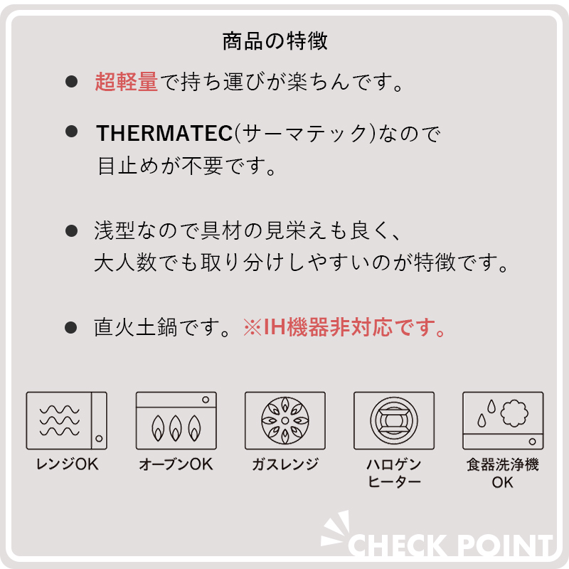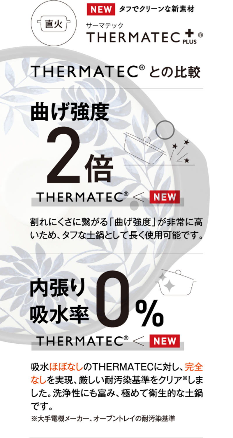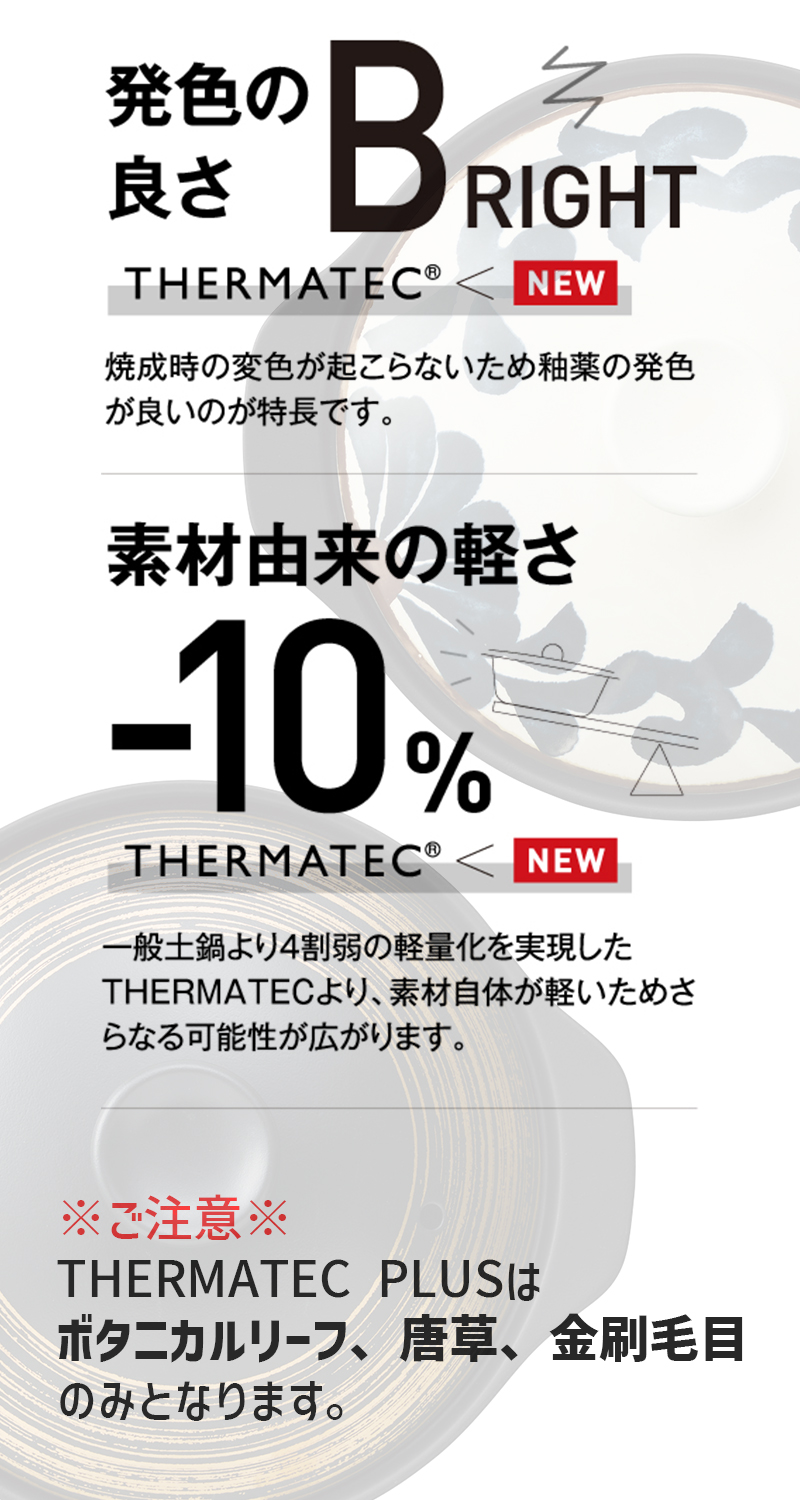 | 機能・その他 | 1〜2人用 電子レンジ対応 家庭用食洗機対応 オーブン対応 ガスレンジ対応 ハロゲンヒーター対応 ※IH調理機には対応しておりません。 ※目止め不要。 ※ボタニカルリーフ、唐草、金刷毛目は新素材「サーマテックプラス」となります。それ以外のお色は従来の「サーマテック」となります。 |