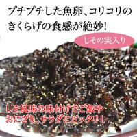【原材料名】醤油(大豆、小麦を含む)、砂糖、きくらげ、スケトウダラ卵、米発酵調味料、しその実、醸造酢、かつお風味調味料、ソルビット、調味料(アミノ酸等)、香料、保存料(ソルビン酸K)、甘味料(ステビア)、酸味料