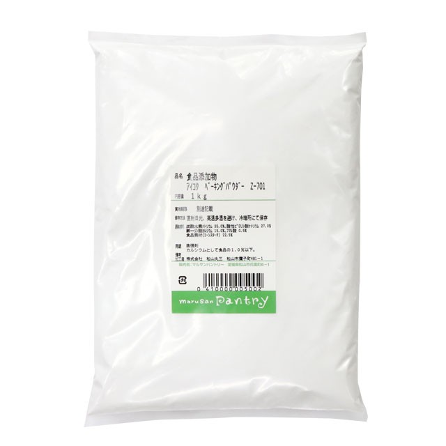 【原材料名】炭酸水素ナトリウム35.0%、酸性ピロリン酸ナトリウム27.0%、第一リン酸カルシウム15.0%、フマル酸0.5%、食品素材(コーンスターチ)22.5%