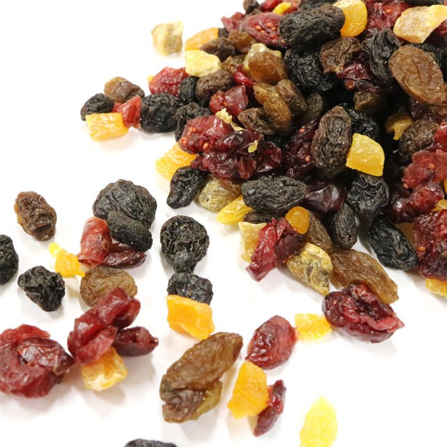 【原材料名】サルタナレーズン(トルコ産)、モハベレーズン(アメリカ産)、アプリコット(トルコ産)、イチジク(トルコ産)、クランベリー(アメリカ産)、イチジク、砂糖、米粉、植物油/漂白剤(二酸化硫黄)