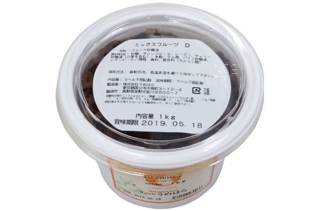 【原材料名】砂糖(国内製造)、オレンジピール、レーズン、チェリー砂糖漬け(小麦を含む)、水飴、ラム酒、パイン砂糖漬け、レモンピール/酒精、香料、着色料(カルミン酸)