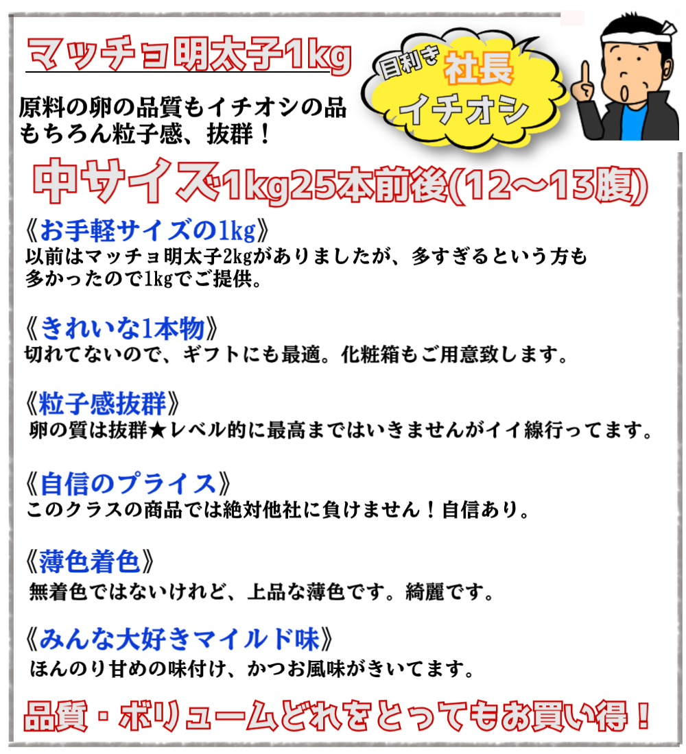 マッチョの辛子明太子2 中サイズ 1kg(着色有り) めんたいこ 送料無料 業務用 魚卵 明太子 ご贈答仕様(北海道・沖縄へは別途送料1000円かかります。)