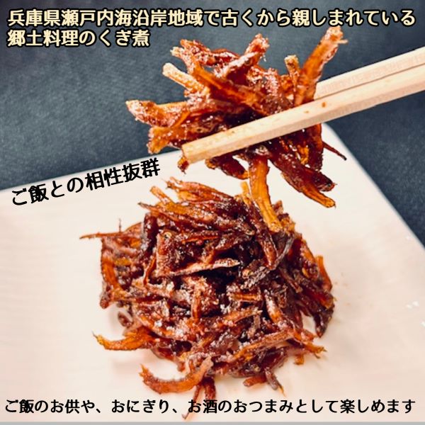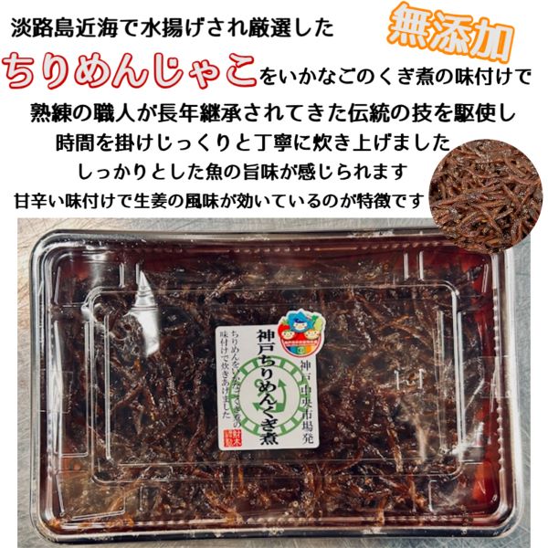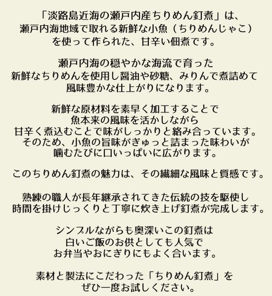 【釘煮原材料名】ちりめん(淡路島産または淡路島近海の瀬戸内産)、砂糖、醤油、生姜、味醂、水飴