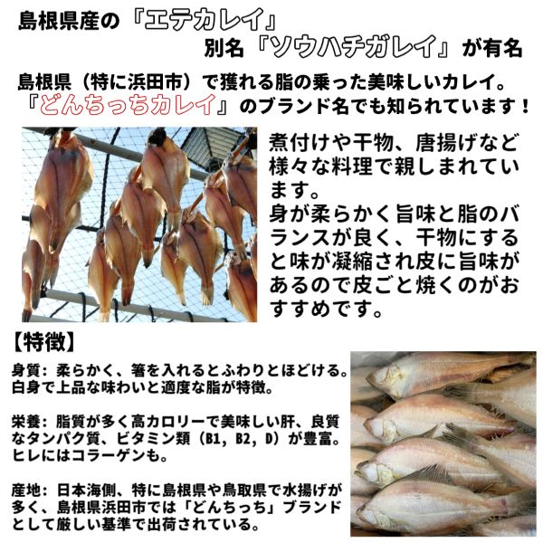 【スタッフより】◎当市場には色んなカレイの一夜干しが入荷します。今回、ご紹介するのはその島根県、山陰沖にて現在水揚げのある肉厚のエテカレイです。