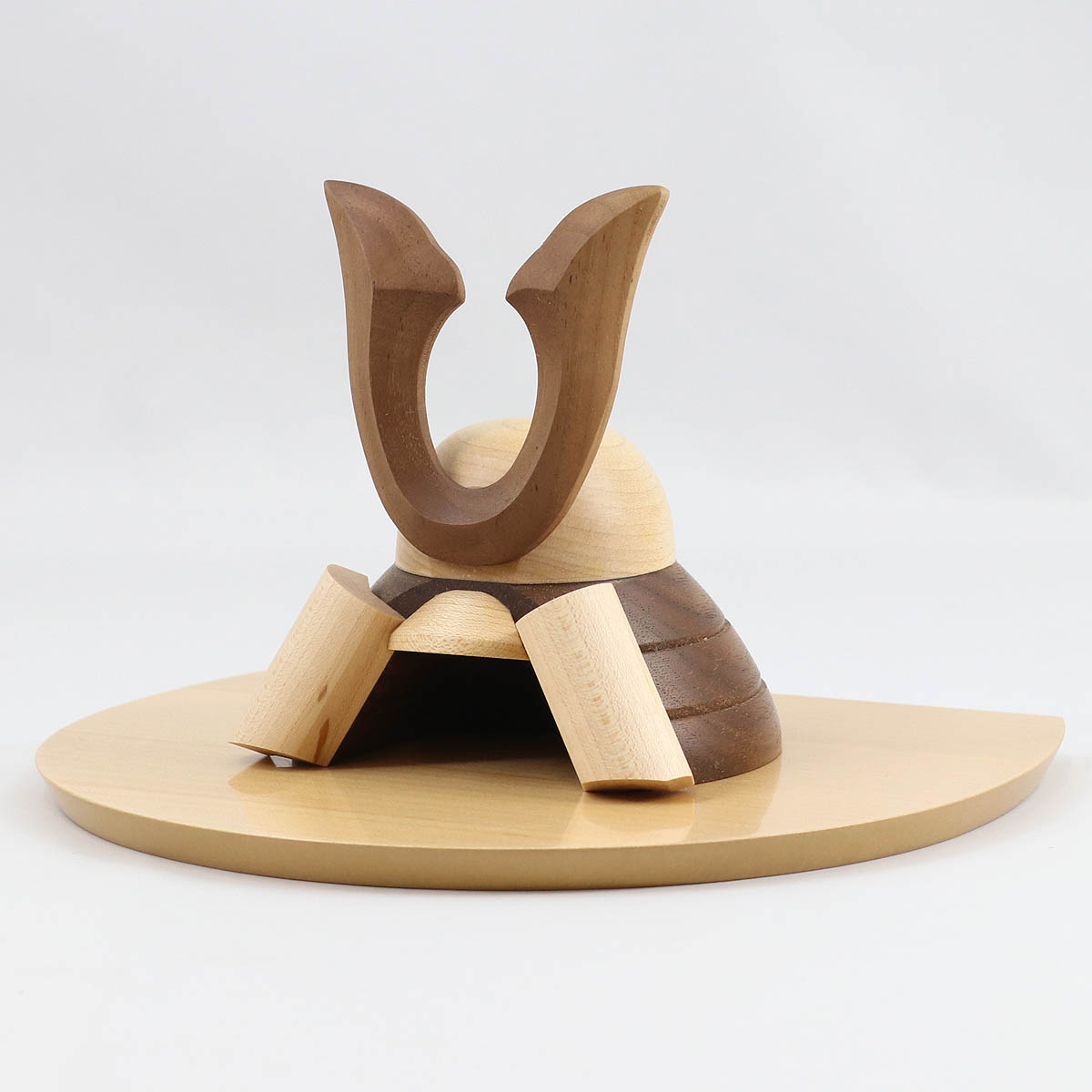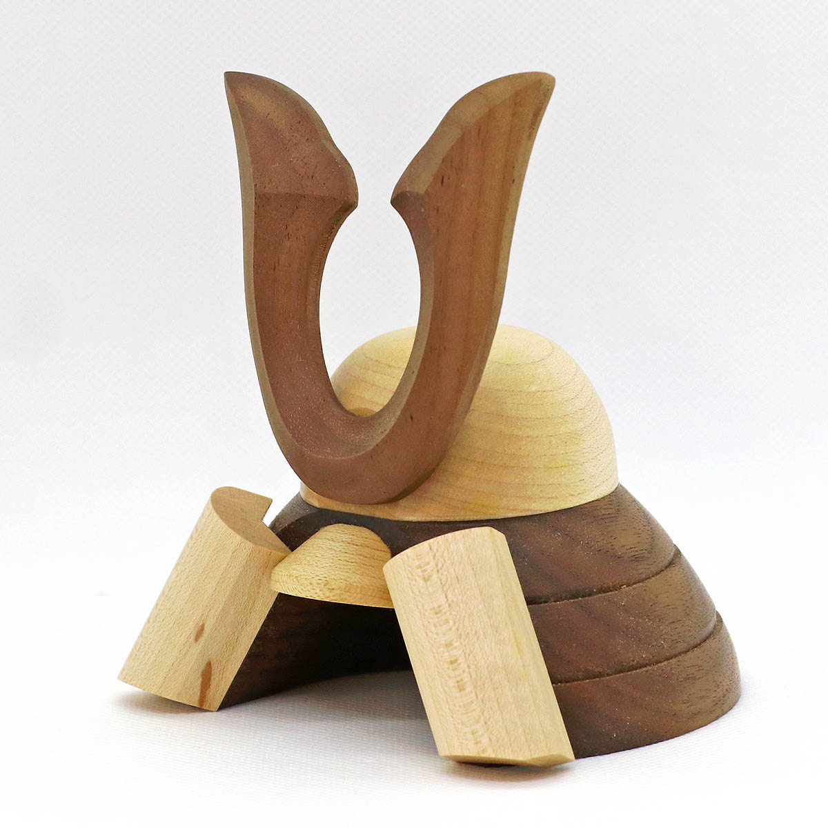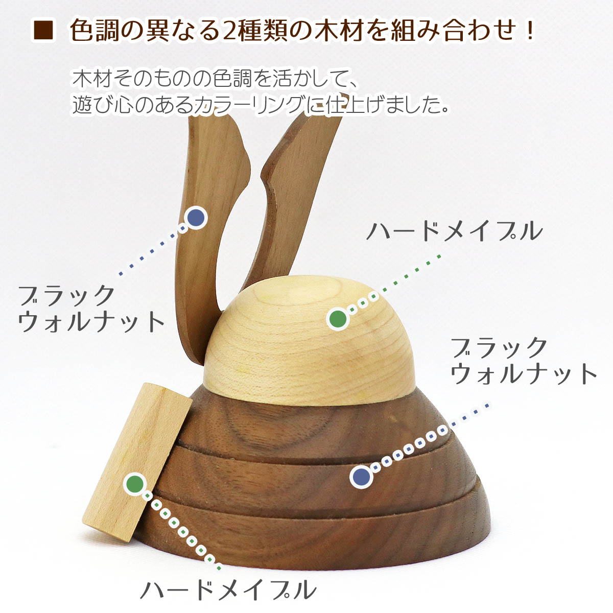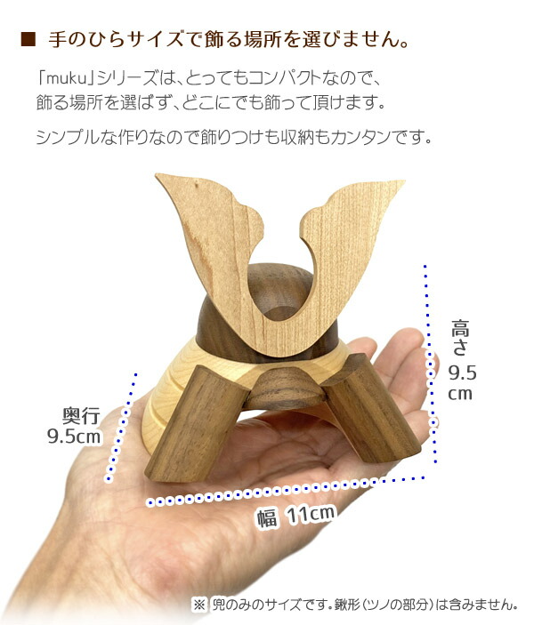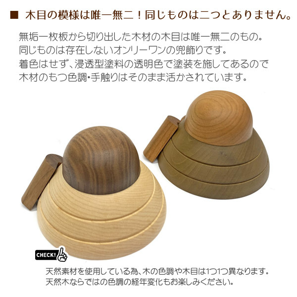■無垢材を使用した木製兜シリーズ 『muku(むく)』 「muku(むく)」シリーズは、木の温もりや質感を感じられるよう、「天然無垢一枚板」から切り出した木材を使用して、赤ちゃんにも、自然にも優しい「自然塗料」で仕上げた、優しさの詰まった木製の五月人形です。