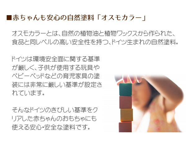 オスモカラーとは、自然の植物油と植物ワックスから作られた、食品と同レベルの高い安全性を持つ、ドイツ生まれの自然塗料。 ドイツは環境安全面に関する基準が厳しく、子供が使用する玩具・ベビーベッドなどの育児家具の塗装には非常に厳しい基準が設定されています。 オスモカラーは、そんなドイツのきびしい基準をクリアした、赤ちゃんのおもちゃにも使える安全な塗料です。