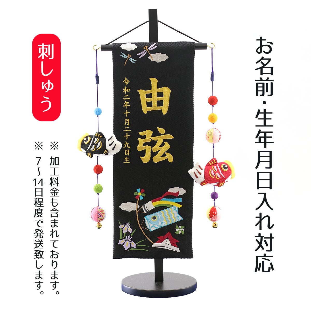 名前旗 男の子用 端午の節句 黒ジャガード刺しゅう (特中) 鯉のぼりつるし 台付き