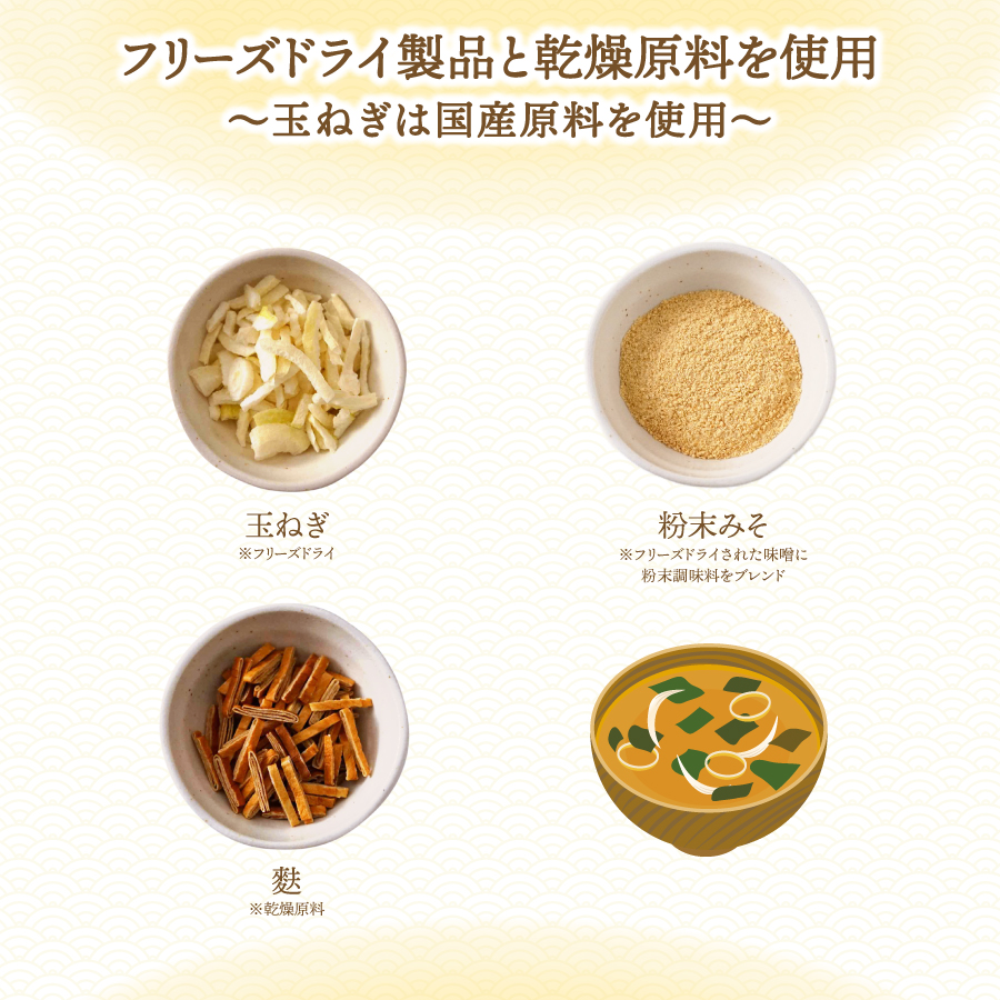 | 鰹節 / かつおぶし / かつお節 / かつお粉末 / かつお粉 / 鰹粉 / 鰹粉末 / ねぎ / ネギ / たまねぎ / 玉ねぎ / 玉葱 / わかめ / お麩 / おふ / フリーズドライ / 味噌 / みそ |
