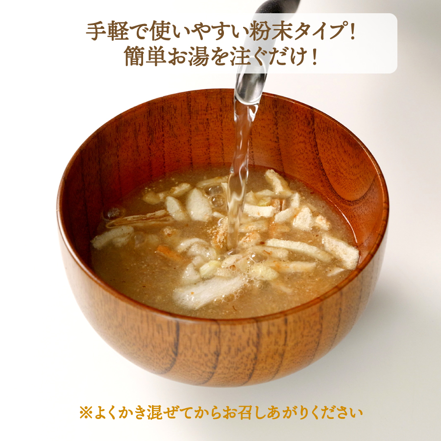 | 袋の中身をカップに入れ、熱湯160mlを注ぎ、よくかき混ぜ、約1分で出来あがります。 |