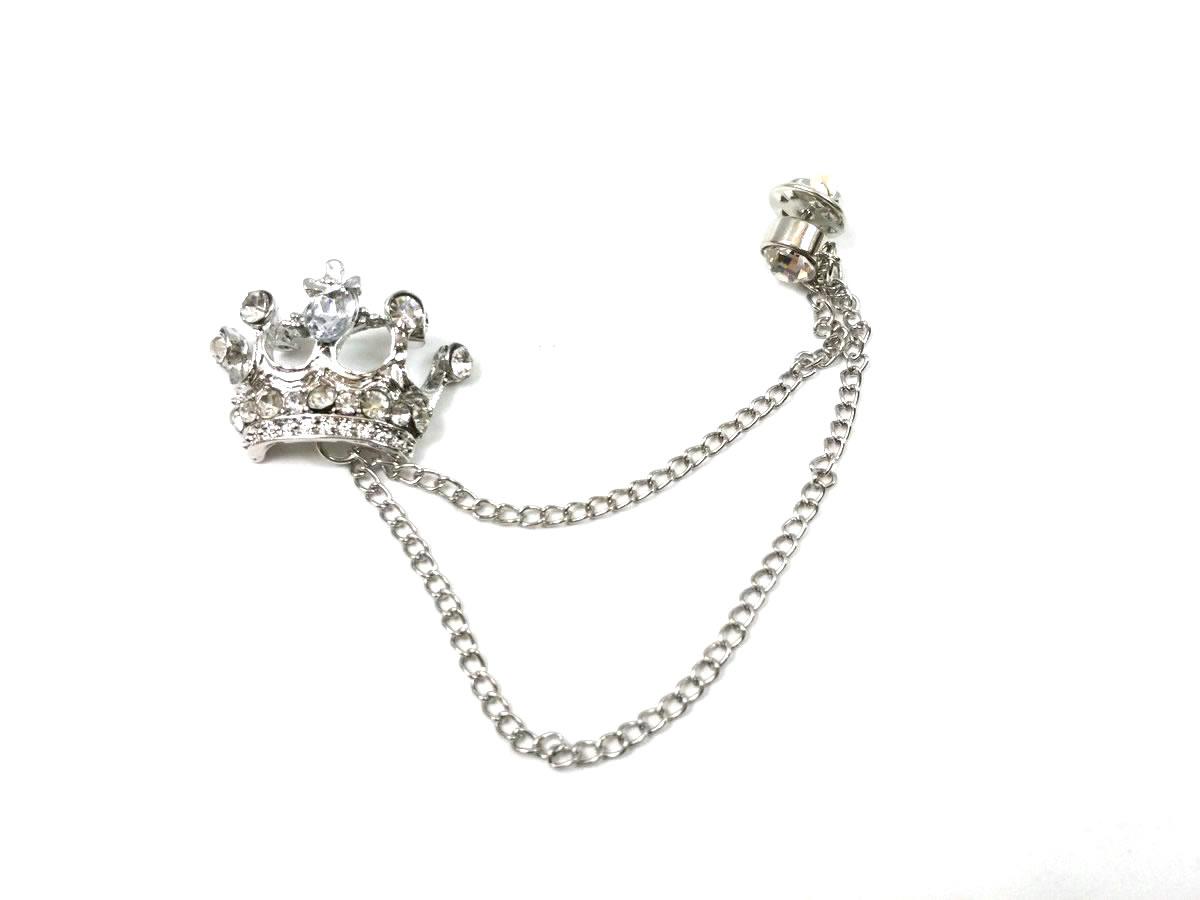 クラウン ピンバッジ チェーン 王冠 ピンズ シルバー ラインストーン 3.5cmX2.5cm かわいい おしゃれ 留め具 バッチ 飾り方 使い方 付け方 バッヂ 装飾具 パーツ