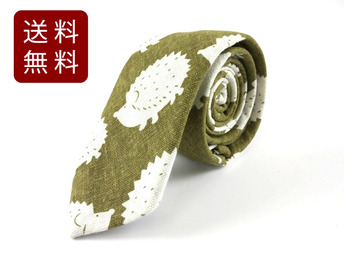 ナロータイ 細ネクタイ コットン100% ハリネズミ モスグリーン 幅6cm 動物 剣先 プレゼント 鼠 結婚式 おしゃれ ビジネス 長さ 清潔 結び方 カフス 優しい 女性