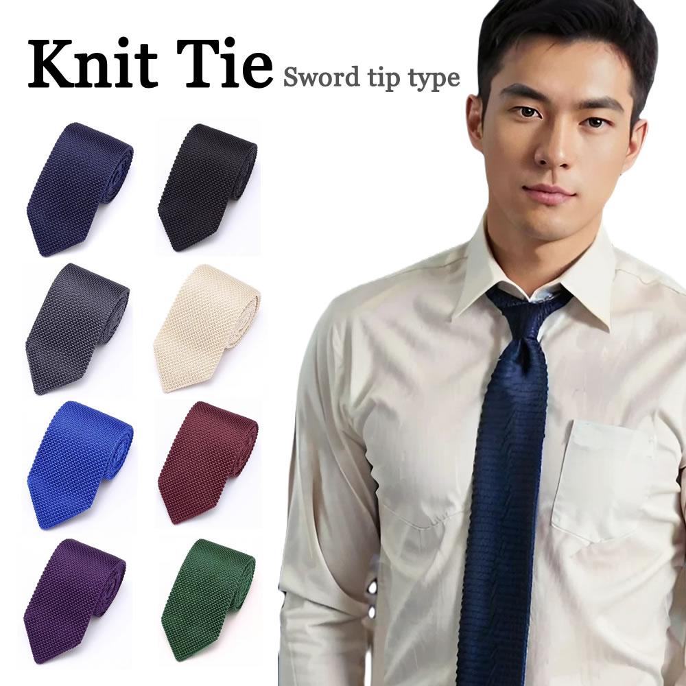 シンプルで無地のニットタイは、人気の剣先タイプ。どんなシーンにもマッチする、洗練されたデザインです。