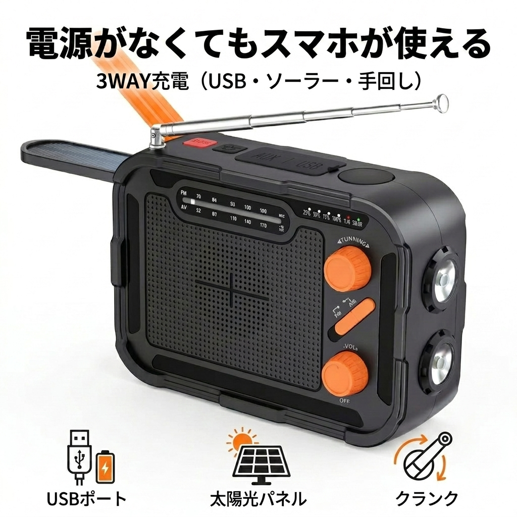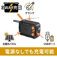 ●3通りの充電...USB充電・ソーラー充電・手回し充電に対応